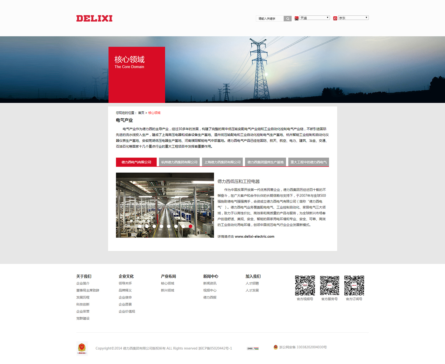 作為中國電氣行業的龍頭企業,德力西現有五大生產基地:上海高壓電器和成套設備生產基地、溫州低壓輸配電和工業自動化控制電氣生產基地、杭州智能工業控制和自動化儀器儀表生產基地、安徽蕪湖低壓電器生產基地、河南濮陽智能電氣中部基地。電氣產品在中國境內遍布60000多家銷售門店,產品和服務支持網絡覆蓋60多個國家和地區。